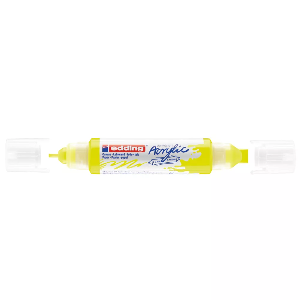 Kétoldalú edding 3D akril tubus egyedi effektusokhoz és sötét és világos felületekre történő festéshez, ideális olyan anyagokhoz, mint a vászon vagy a festőpapír. - A kétoldalú tubus két különböző írócsúccsal rendelkezik 2 - 3 mm és 5 - 10 mm vonalvastagságban. - A kiváló minőségű, pigmentált, vízbázisú akrilfesték száradás után rendkívül tartós, átlátszatlan, fényálló és szagtalan. - A neon sárga szín áttetsző.- 26 féle színválasztékban elérhetők- Keresse a további változatokat - edding 5000 és az edding 5100-at, valamint az edding 5300-as akril markereket.Katalóguskód: 36516