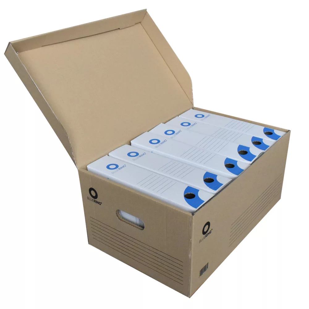 5db 10cm-es vagy 6db 8cm-es Bluering archíváló boxy tárolására alkalmas doboz, felfelé nyíló tetővel. Gyors és gazdaságos tárolást tesz lehetővé, lapra szerelten szállítható és könnyedén összeállítható. Katalóguskód: 2368
