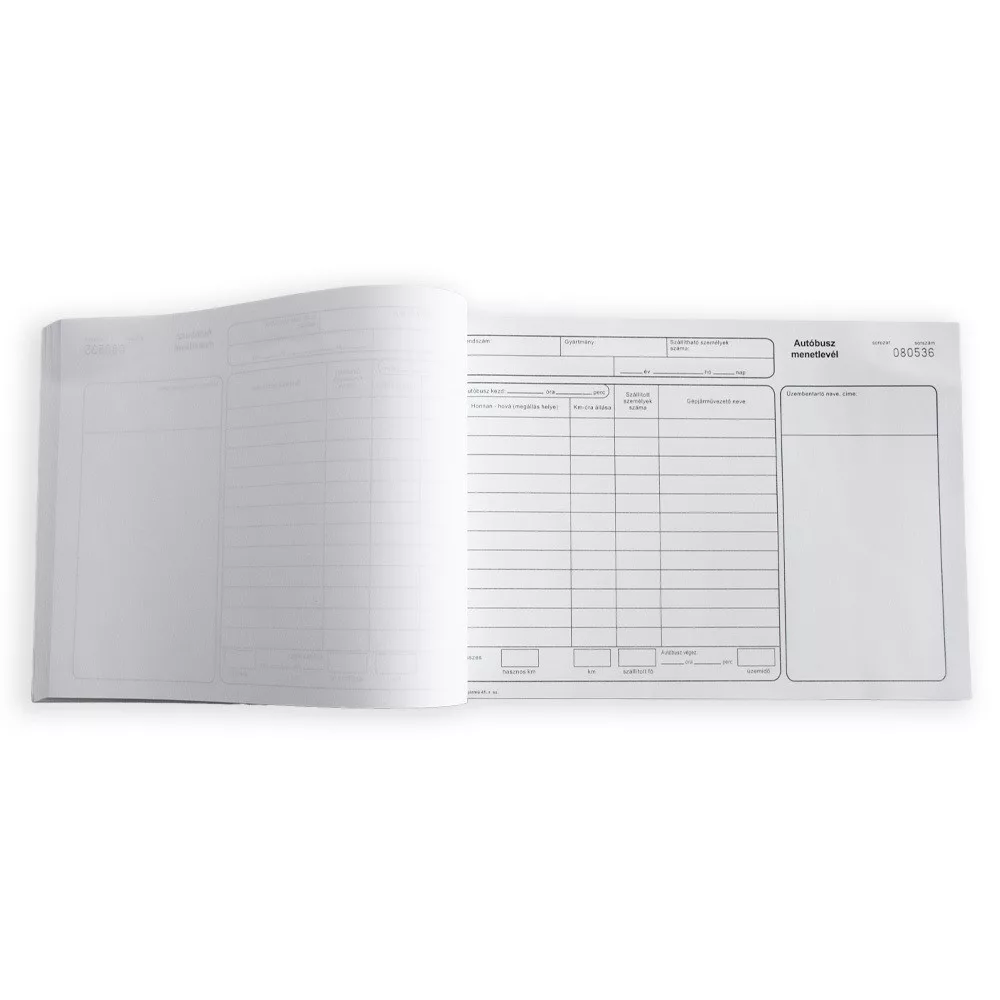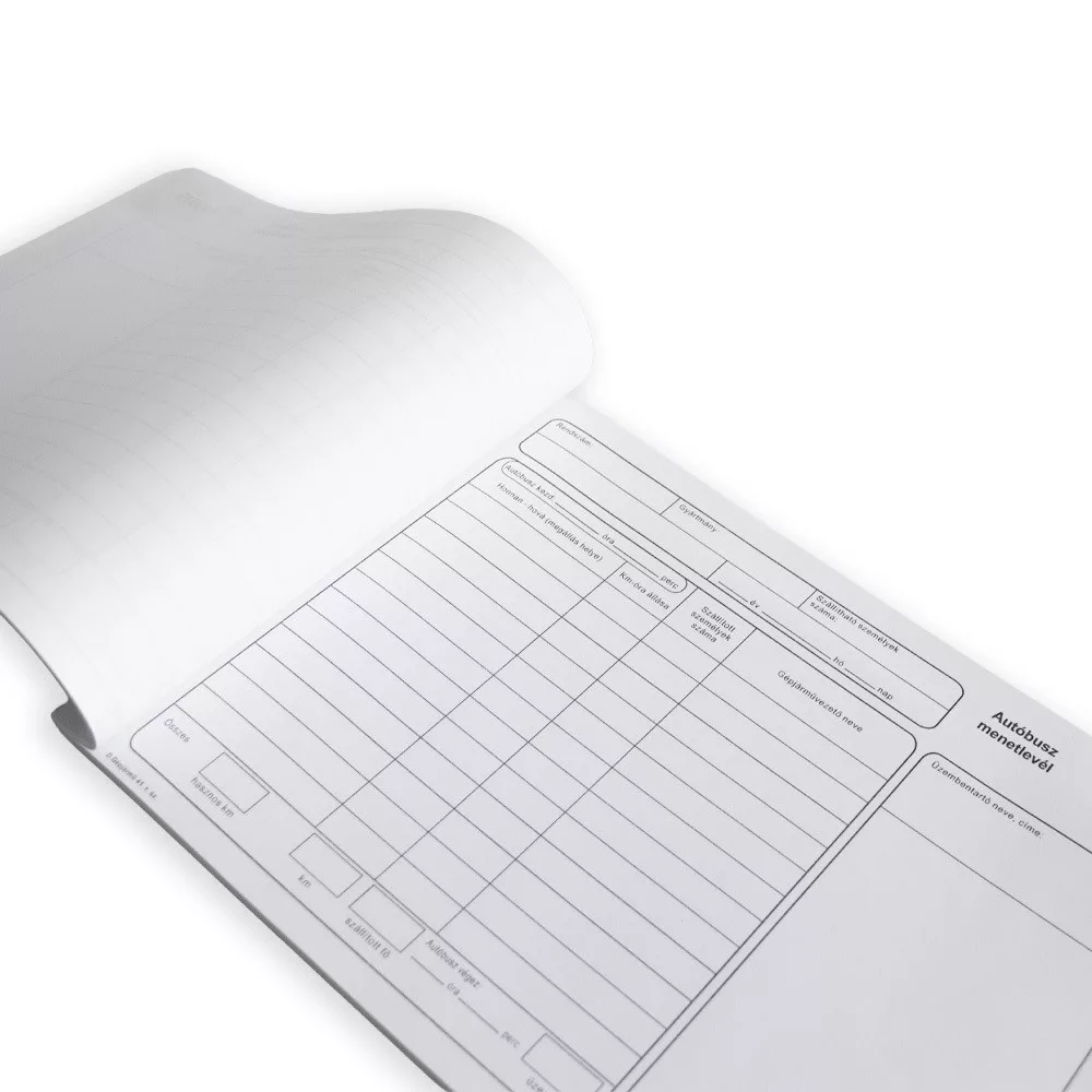 Felhasználási terület: Az autóbuszok számára kötelező a menetlevél használata. A szállítólevél meglétét és annak tartalmát a hatóságok ellenőrzik. 100 lapos tűzött tömb,A4,fekvő,rövidebb oldalán tűzve,karton borítás,80 g/m2 ofszet belívek. Katalóguskód: 32290