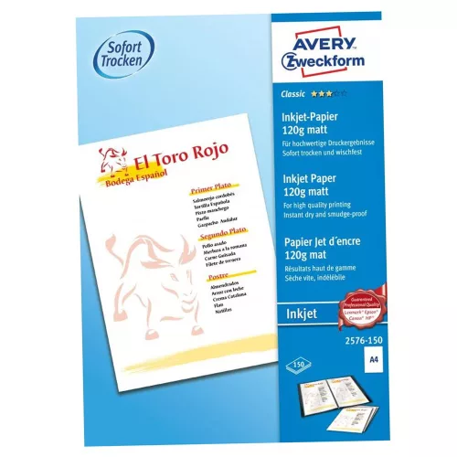 2576-150 kódszámú, A4 méretű AVERY ZWECKFORM szuperior tintasugaras matt fotópapírral a legjobb minőségű nyomtatási eredményt érheti el. 150 ív egy csomagban. A speciális matt bevonat kiváló színmeghatározást és színekben gazdag nyomtatot biztosít. Az extra erős 120g-os tintasugaras fotópapír nyomtatás után azonnal szárad és elkenődésmentes a hatékony száradási tulajdonságnak köszönhetően. Az Avery Zweckform tintasugaras nyomtatópapír tökéletes professzionális prezentációk és menülapok nyomtatására. FSC® minősített papír, mely felelősen kezelt erdőből származik.Katalóguskód: 47577