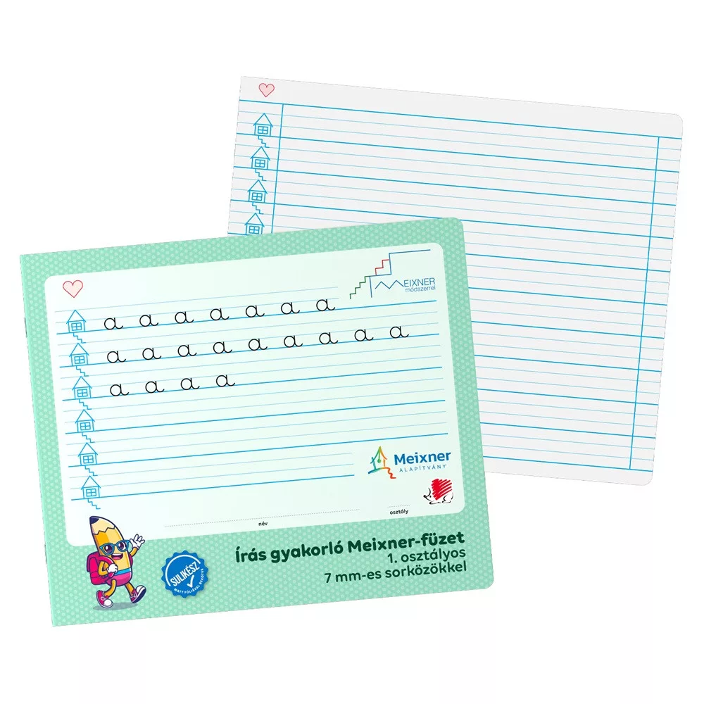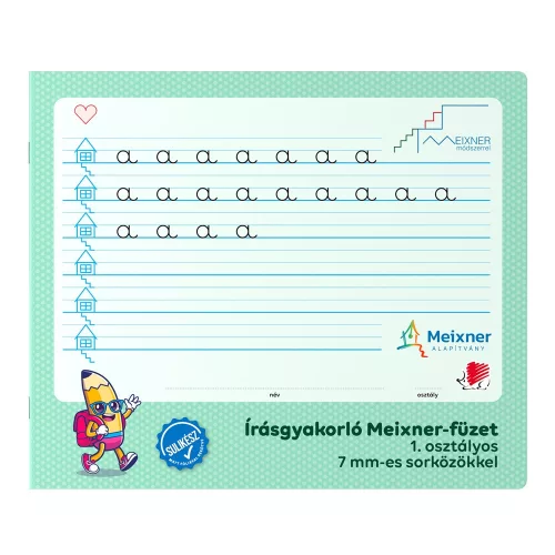 Írás gyakorló füzet az 1. osztályosok számára, amely a Meixner Alapítvány együttműködésével és ajánlásával jött létre. Speciális vonalazású és kialakítású füzet alkalmas a Meixner-féle írás tanulás elsajátítására és gyakorlására. A házikó megkönnyíti a vonalközben való tájékozódást, a szívecske a balról jobbra haladást. A nagyobb – 7 mm-es – vonalközök elég helyet hagynak az első betűk megformálásához. A füzet méretét a kisgyermekek testarányaihoz igazítottuk, amely 32 lapos, fekvő formátumú speciális méretű: 245*295 mm. A sarkok kerekítettek és a füzet SULIKÉSZ; matt fóliával van bevonva. 10 db/csomag. Katalóguskód: 67384