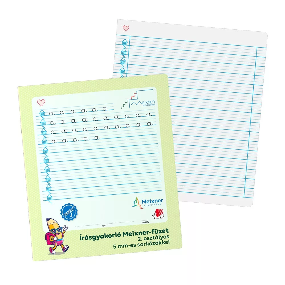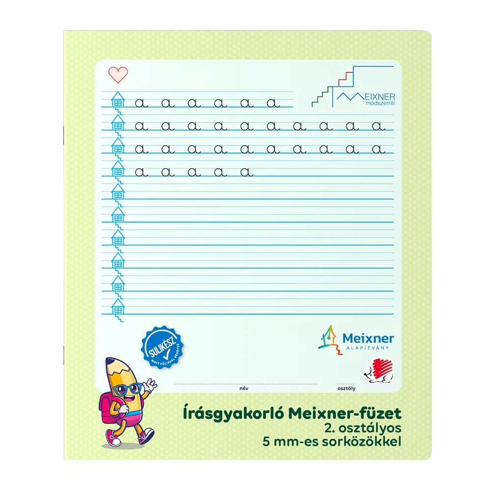 Írás gyakorló füzet a 2. osztályosok számára, amely a Meixner Alapítvány együttműködésével és ajánlásával jött létre. Speciális vonalazású és kialakítású füzet alkalmas a Meixner-féle írás tanulás elsajátítására és gyakorlására. A házikó megkönnyíti a vonalközben való tájékozódást, a szívecske a balról jobbra haladást. A nagyobb – 5 mm-es – vonalközök megkönnyíti a vonalközben való tájékozódást. A füzet méretét a kisgyermekek testarányaihoz igazítottuk, amely 32 lapos, álló formátumú speciális méretű: 295*245 mm. A sarkok kerekítettek és a füzet SULIKÉSZ; matt fóliával van bevonva.10 db/csomag. Katalóguskód: 67391
