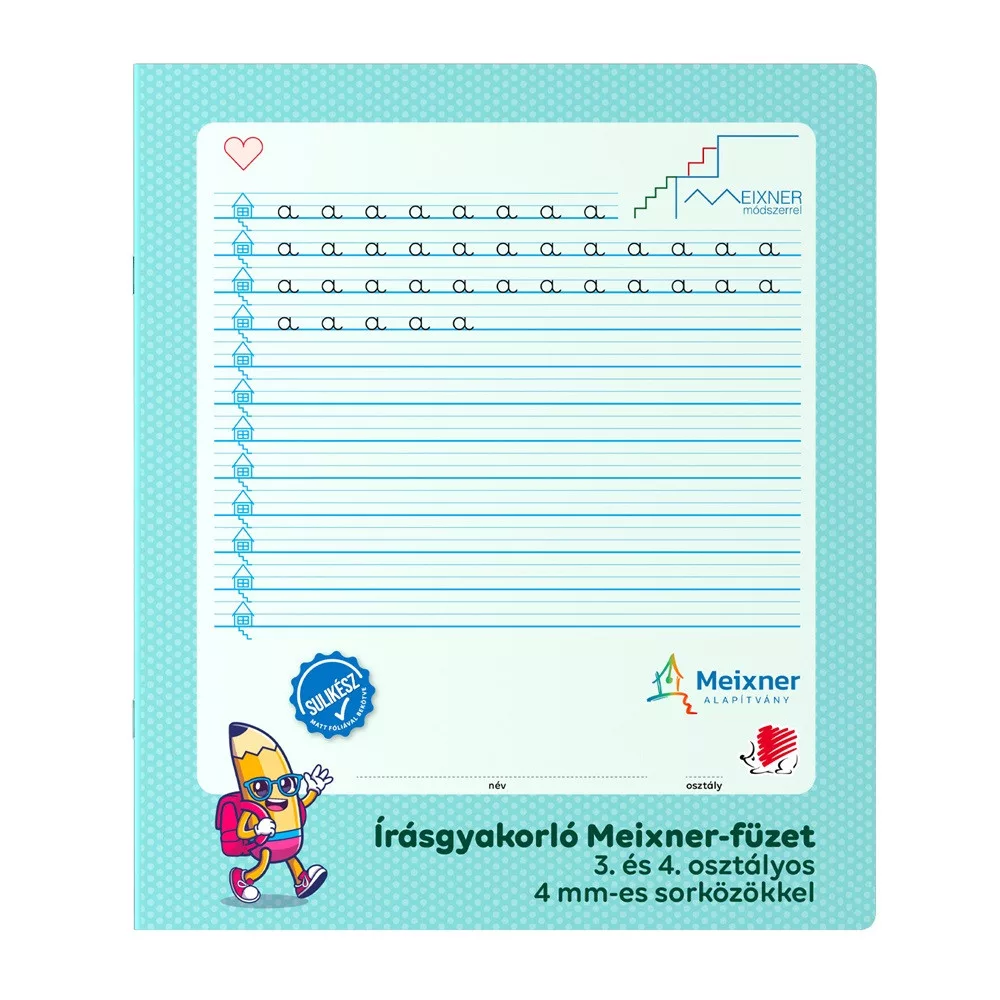 Írás gyakorló füzet a 3. és 4. osztályosok számára, amely a Meixner Alapítvány együttműködésével és ajánlásával jött létre. Speciális vonalazású és kialakítású füzet alkalmas a Meixner-féle írás tanulás elsajátítására és gyakorlására. A házikó megkönnyíti a vonalközben való tájékozódást, a szívecske a balról jobbra haladást. A hármas vonalköz – 4 mm-es – vonalközök megkönnyíti a vonalközben való tájékozódást. A füzet méretét a kisgyermekek testarányaihoz igazítottuk, amely 32 lapos, álló formátumú speciális méretű: 295*245mm. A sarkok kerekítettek és a füzet SULIKÉSZ; matt fóliával van bevonva.10 db/csomag. Katalóguskód: 67392