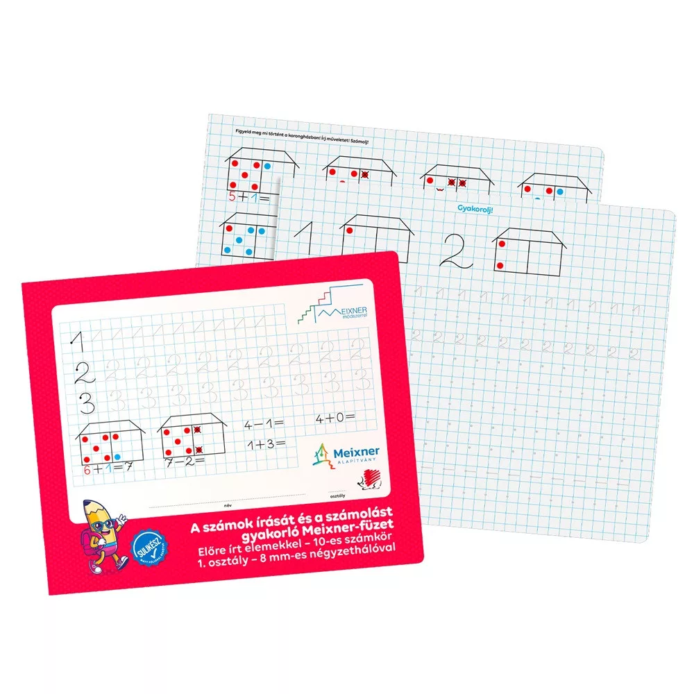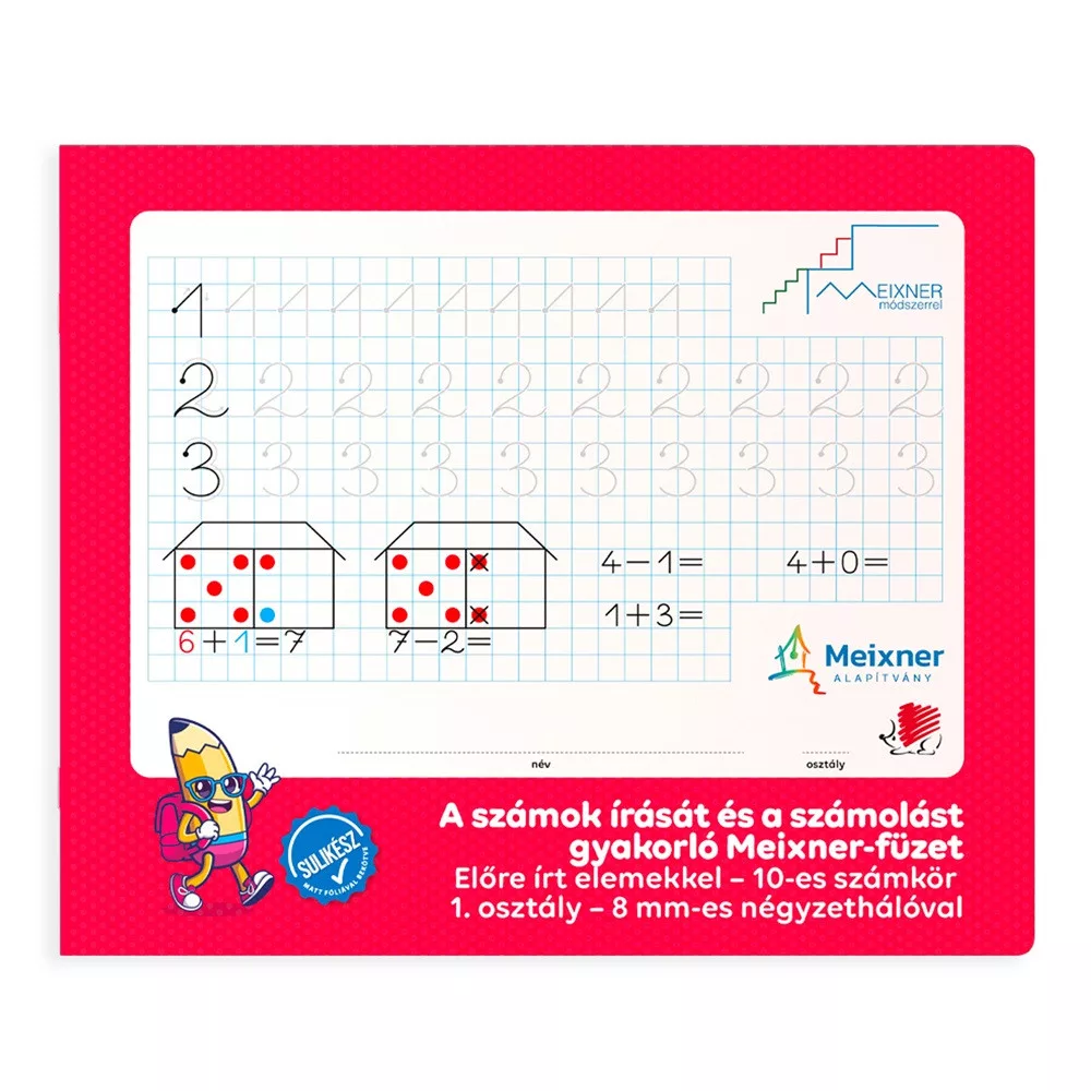 A számok írását és a számolást gyakorló Meixner-füzet az 1. osztályosok számára a 10-es számkörben, amely a Meixner Alapítvány együttműködésével és ajánlásával jött létre. Az első osztályosoknak készült füzetben a nagyobb, 8 mm-es négyzetháló és egyszerű elemekből felépített írásminták segítik a számok és műveleti jelek írásának kialakítását. A korongkép és a számkép egyeztetése, a műveletek korongképeken való ábrázolása megkönnyíti az elemi számolás elsajátítását a 10-es számkörben. A füzet jól használható a számfogalmak kialakítására, a műveletek gyakorlására otthon és a matematika órákon egyaránt. A nagyobb – 8 mm-es – négyzetháló elég helyet hagy a számok és műveleti jelek írásához, begyakorlásához. A füzet méretét a kisgyermekek testarányaihoz igazítottuk, amely 32 lapos, fekvő formátumú speciális méretű: 245*295 mm. A sarkok kerekítettek és a füzet SULIKÉSZ; matt fóliával van bevonva. 10 db/csomag. Katalóguskód: 67390