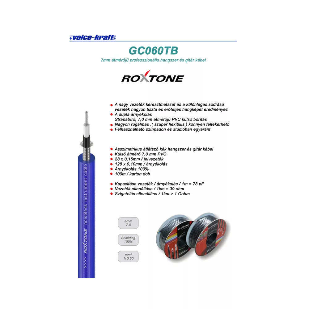 GC060TB Ø7mm professzionális gitárkábel (transparent kék)