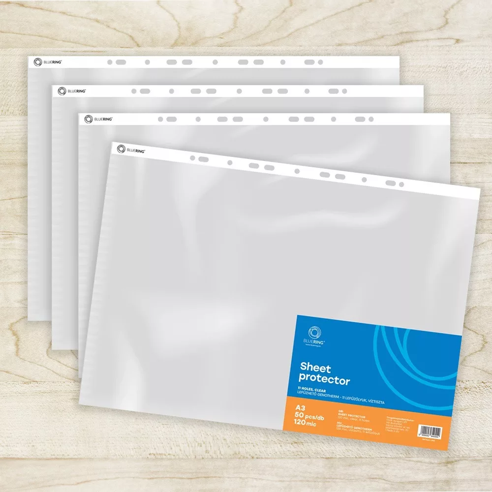 - A3 méretű dokumentumok hosszú távú, lyukasztás nélküli tárolására, - álló formátum, a rövidebbik felső oldalon nyitott - fényes víztiszta felület - 11 lefűzőlyuk a hosszabbik oldalon - vastagság: 120 µ - Gyűjtő: 20 csomag/karton Katalóguskód: 8816