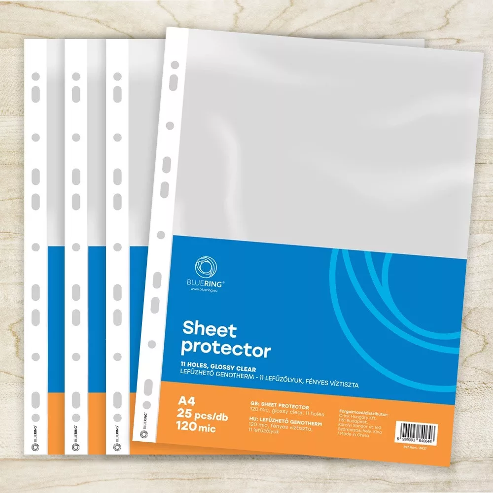 100db/csomag, A4 méretű dokumentumok hosszú távú, lyukasztás nélküli tárolására - felül és belül is teljes hosszában nyitott - narancsos felület - 11 lefűzőlyuk - az összes, szabványos gyűrűs és emelőkaros iratrendezőbe lefűzhető - vastagság: 115 µ - Gyűjtő: 10 csomag/karton Katalóguskód: 8826
