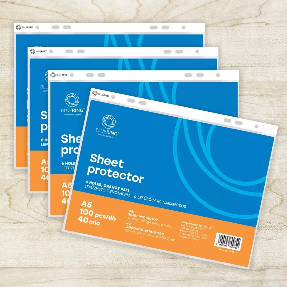- A5 méretű dokumentumok hosszú távú, lyukasztás nélküli tárolására - felül nyitott - narancsos felület - 6 lefűzőlyuk - az összes, szabványos gyűrűs és emelőkaros iratrendezőbe lefűzhető - vastagság: 40 µ - Gyűjtő: 40 csomag/karton Katalóguskód: 21649