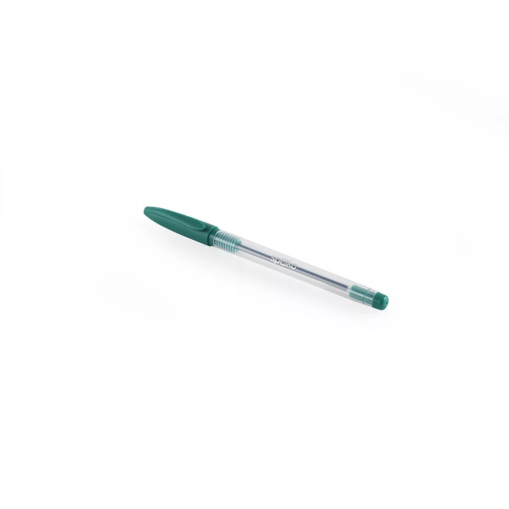 Eldobható golyóstoll átlátszó testtel, mely lehetővé teszi a tinta mennyiségének figyelemmel követését. A toll fogórészének és kupakjának színe megegyezik az íráskép színével. Bordázott fogórész a csúszásmentes fogás érdekében. Nyomtatott logó a testen.