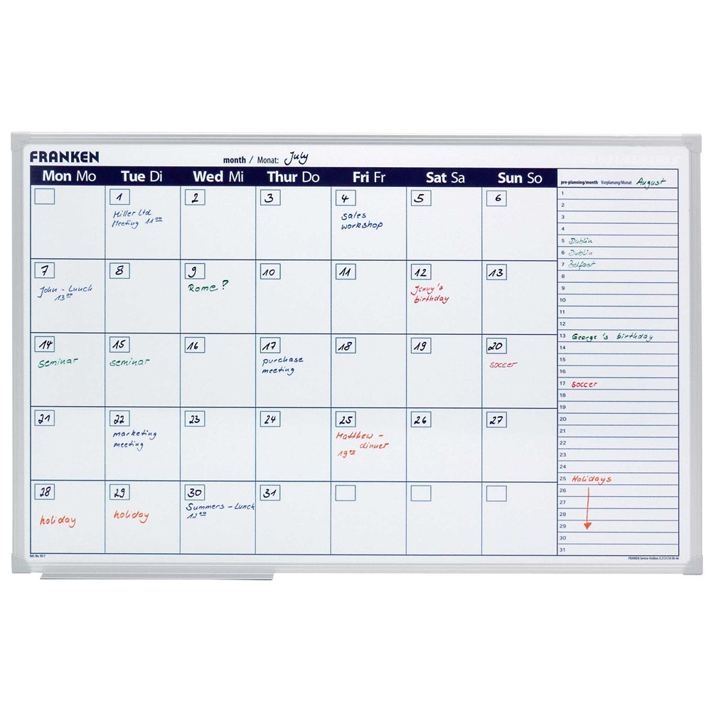 A kiszállított tábla sérülésmentes állapotáról a futár távozása előtt győződjön meg, mert annak állapotáról utólagos reklamációt nem áll módunkban elfogadni, megértésüket köszönjük!Ez a havi tervező megjeleníti az egész hónap tervezését, valamint egy áttekintő oszlopot a következő hónapra is. A feladatok tervezése egy teljes hónapra látható. Egy nap mérete 96 x 98 mm, biztosítja az információk átláthatóságát. Mágneses, írható, szárazon törölhető. Írószertartóval szállítjuk. Katalóguskód: 30782