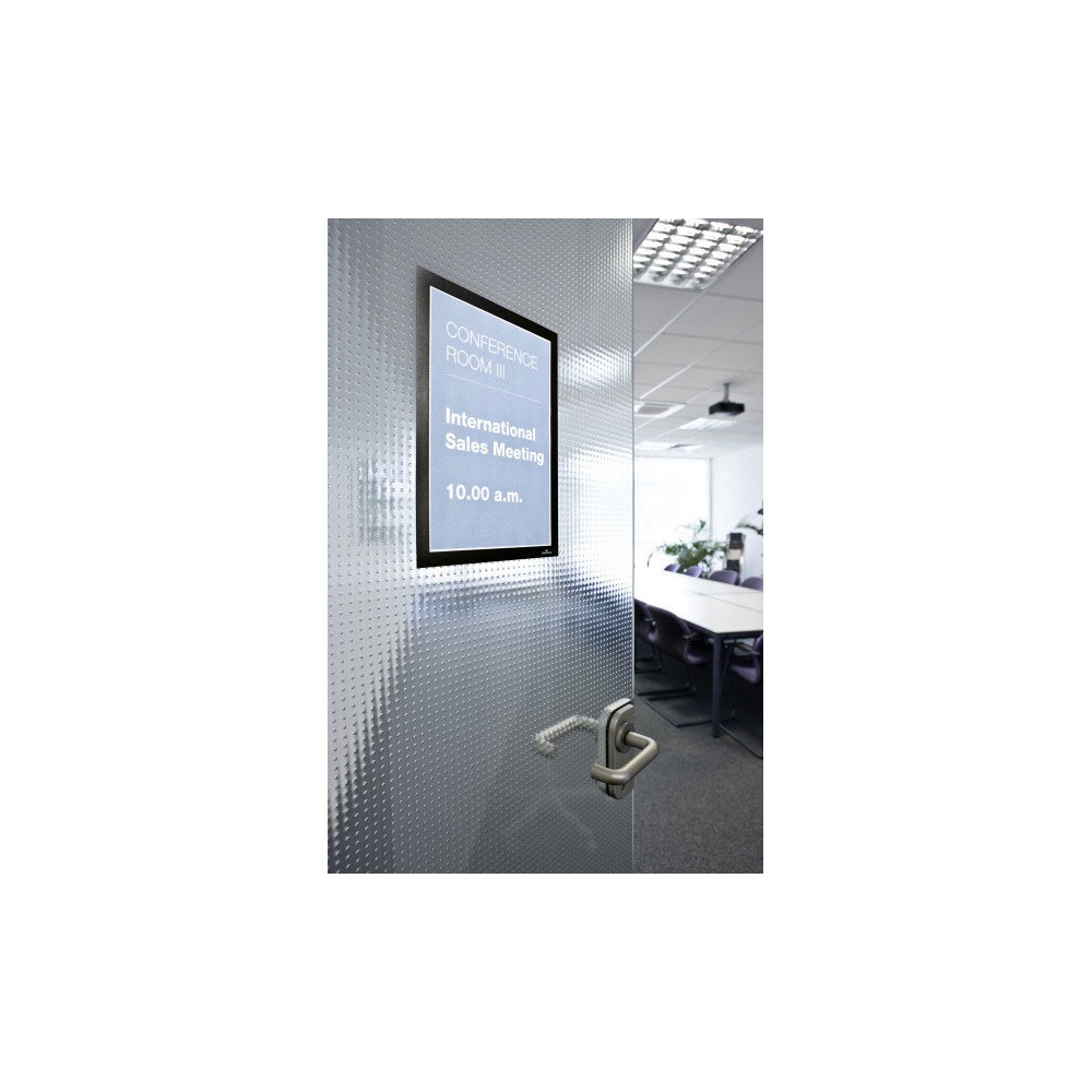 DURABLE-DURAFRAME® keret, öntapadó hátlappal és mágneses előlappal többféle méretben. A DURAFRAME® segítségével profin és kényelmesen helyezhetjük ki dokumentumainkat. Egyszerűen vegyük le a védőfóliát és ragasszuk fel az öntapadó keretet bármilyen sima, kemény felületre, például ablakra, iratszekrényre vagy ajtóra. A DURAFRAME® könnyedén áthelyezhető például üveg felületeken anélkül, hogy nyomot hagyna. - Információ kihelyezés professzionális módja - A kihelyezett dokumentumok egyszerű cseréje a mágneses záródásnak köszönhetően - Könnyen kihelyezhető bármilyen sima felületre - Felhasználási területek: hirdetések, információ kihelyezés, tájékoztatás, irányítás - Üvegen használva a keret mindkét oldalon látható, így két irányban is lehet kommunikálni, elegáns formában - Álló és fekvő formátumban is használható - Külső méret: 236 x 323 mm Katalóguskód: 27010