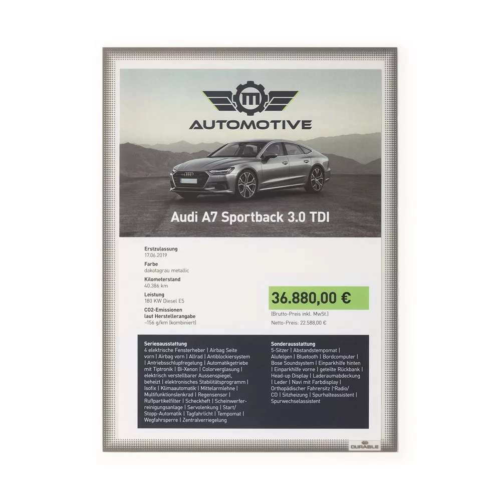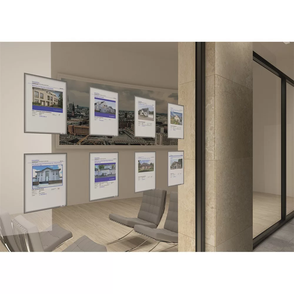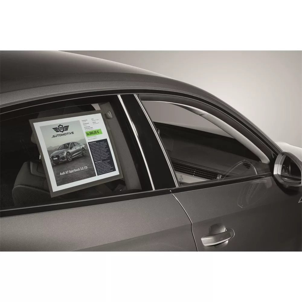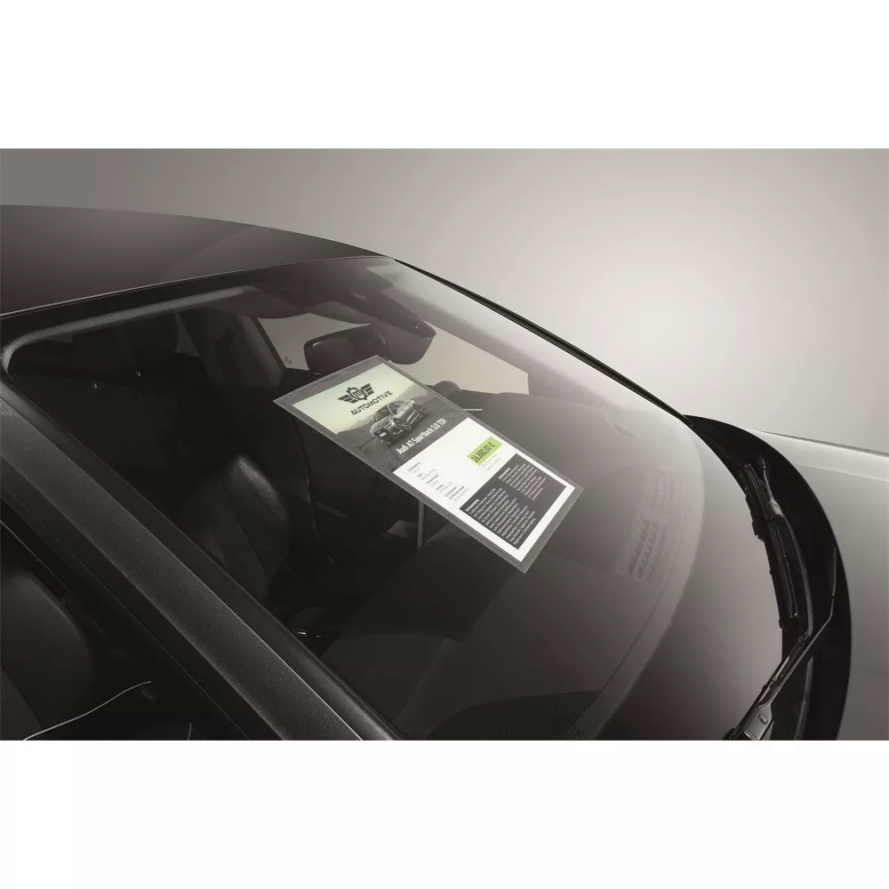 Feliratozási megoldás ívelt üvegfelületek számára: A statikusan tapadó információs tasakok alkalmasak arra, hogy ajánlatokat helyezzünk ki velük az autó ablakaira, kirakatokba, vagy kínáló pultok üveg felületeire. Az öntapadó keret statikus úton (ragasztómentes) rögzül. Hőálló és stabil kb. 70°C-ig, UV-álló 2 évig, Nyom nélkül eltávolítható - újrafelhasználható. Könnyű dokumentumcsere a hátlapon elhelyezett kivágásnak köszönhetően. Belső méretek: 303 mm x 216 mm (M x SZ), Külső méretek: 323 mm x 236 mm (M x SZ).Katalóguskód: 31568