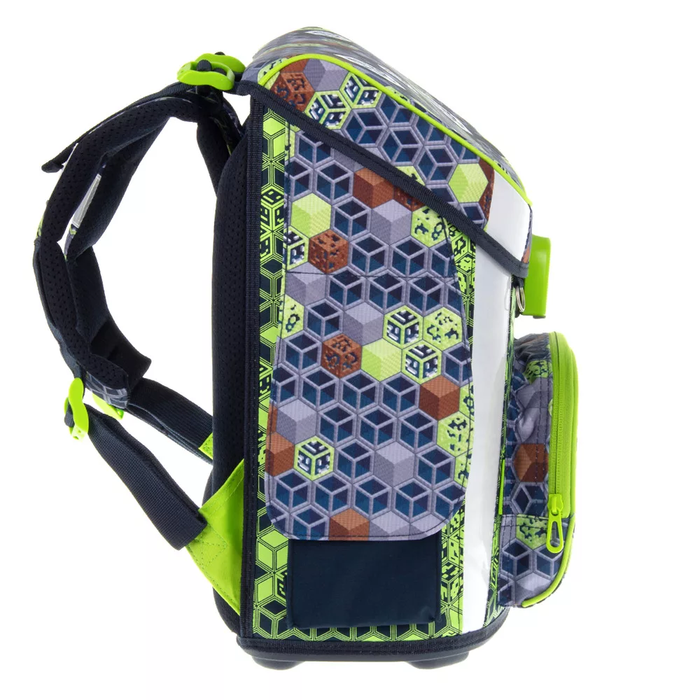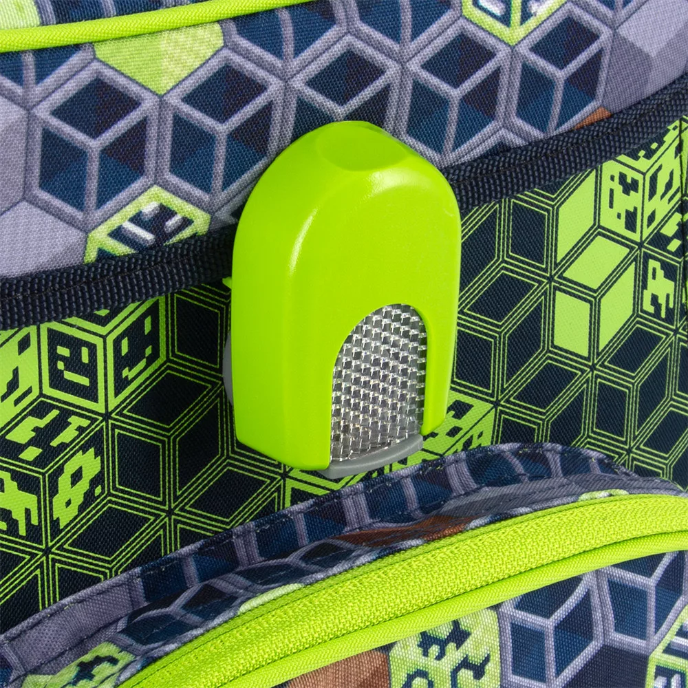Hátizsák formájú iskolatáska. Könnyű súlyú, formatartó szerkezetű, vízlepergető anyagból. Gerinckímélő, vastagon párnázott, merevített, ergonómikus hátkiképzéssel. Puha, méretre állítható vállpántokkal és plusz állítható pántokkal, amelyekekkel szabályozható, hogy mennyire álljon feszesen a gyerek hátához simulva a táska. Alja tartós kemény műanyag. Nagy felületű fényvisszaverő elemekkel elől, oldalt és a vállpántokon. Felülről könnyen pakolható, teteje FIDLOCK mágneszárral záródik. Belsejében egy textil elválasztó elemmel, két nagy rekesszel. A táska tetején belül átlátszó műanyag órarendtartóval és órarenddel. Oldalán két zsebbel a kulacs részére, elején egy cipzáros zseb az uzsonnás doboz részére. Tetején műanyag fogantyúval. Mérete: 330x410x250 mm. Súlya: 1.1 kg. Táska űrtartalma: 18 l. Terhelhetőség: 12 kg. 3 év garancia