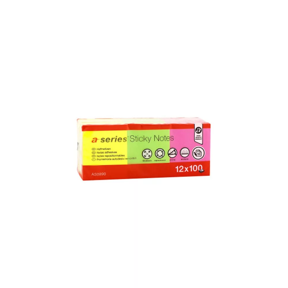 Jegyzettömb öntapadó 50x40mm 12x100lap A-series brilliant mix 4xsárga, 4xpink, 4xzöld