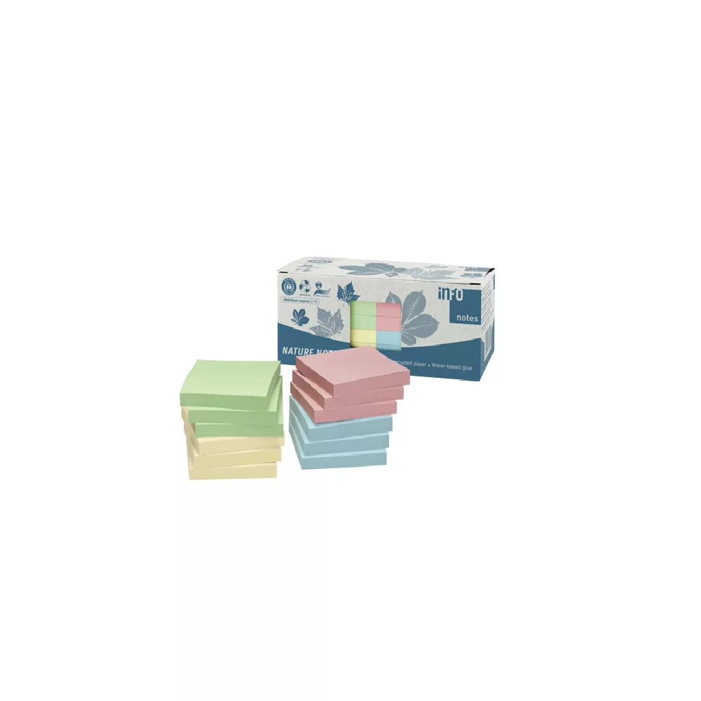 Jegyzettömb öntapadó, 75x75mm, 12x100lap, újrahasznosított Info Notes, sárga, zöld, kék, rózsaszín