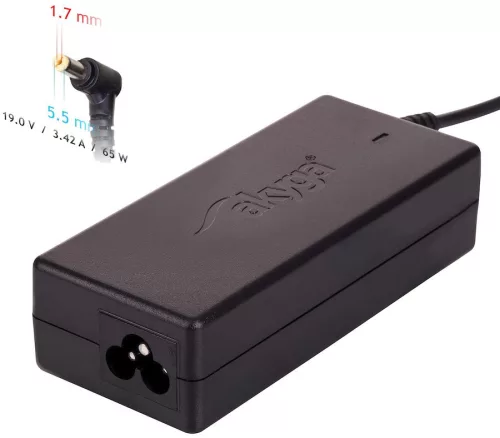 Az Akyga® AK-ND-06 egy notebookokhoz készült tápegység, amelyet 19V/3.42A paraméterekkel rendelkező, 65W teljesítményű és 5.5*1.7 mm-es csatlakozóval ellátott eszközökhöz terveztek.A tápegység kábele kiváló minőségű ferritmaggal van felszerelve, amely megelőzi és megvédi az eszközöket az esetleges zavaró áramoktól és a nagyfrekvenciás zajoktól. A védelmi rendszerek (OVP, OTP, OPP, SCP és OCP) garantálják mind a táplált készülék, mind a tápegység 100%-ban biztonságos és stabil működését. A berendezés számára további biztonságot nyújt a lágyindítási technológia, amely semlegesíti az eszköz indításakor fellépő első áramlöket okozta sokkot.Minden Akyga tápegységet környezetbarát EcoBox csomagolásban szállítanak.Acer laptopokhoz dedikált tápegység.
