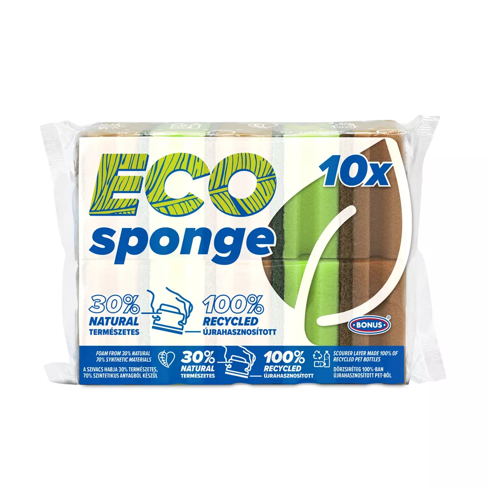 A 10 darabos kiszerelésű BONUS formázott mosogatószivacs igazán gazdaságos, így egyetlen csomaggal akár az egész háztartás igényét kielégíthetjük. Szivacsrétege 30%-ban természetes anyagból készült, míg dörzsi rétege 100%-ban újrahasznosított anyagból, így kímélve a környezetet.