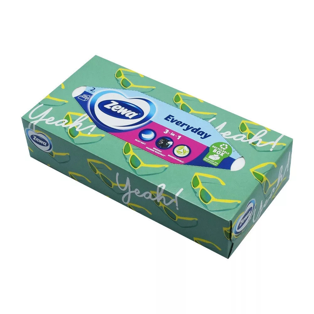 Jó választás a család minden tagjának: az új Zewa Everyday dobozok megbízhatóan jó minőségű papír zsebkendőt kínálnak. Orrfújáshoz, kozmetikai felhasználásra, kéztisztításra, gyümölcsök letörlésére... nincs olyan feladat a mindennapokban, amelyre ne tudnának megoldást. A dobozokat színes, vidám, könnyed design teszi mindenki kedvencévé. Katalóguskód: 55969