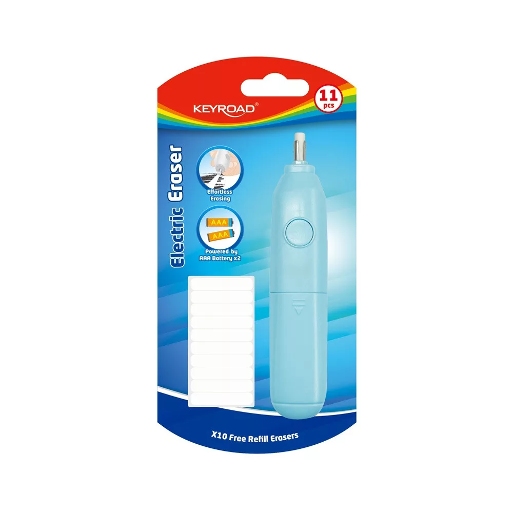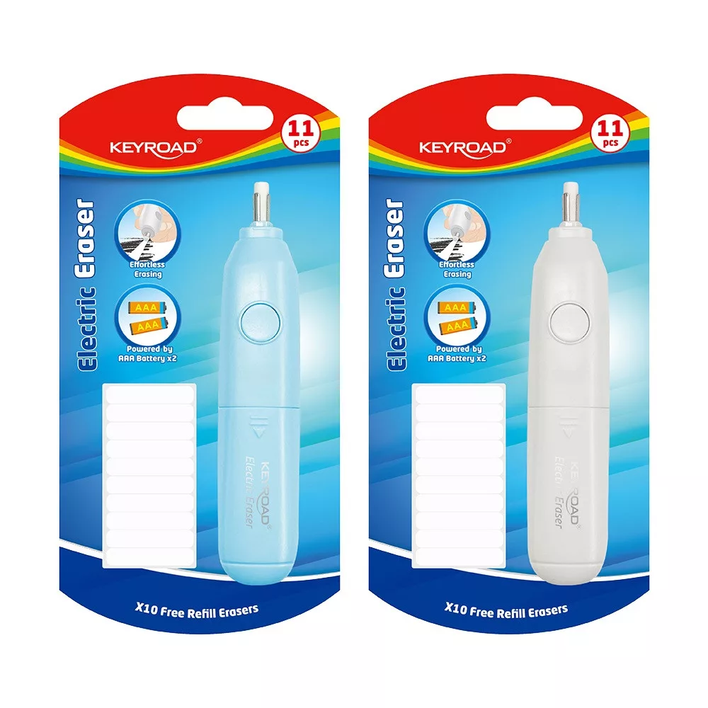 Radír, ami helyettem dolgozik! Ez aztán felvillanyozó! elektromos radír könnyed, erőbefeketetés nélküli és pontos radírozás 2 db AAA elemmel működik vegyes színekben (kék és fehér), a szín nem választható 10 db ajándék cserélhető radírral 1 db/bliszter
