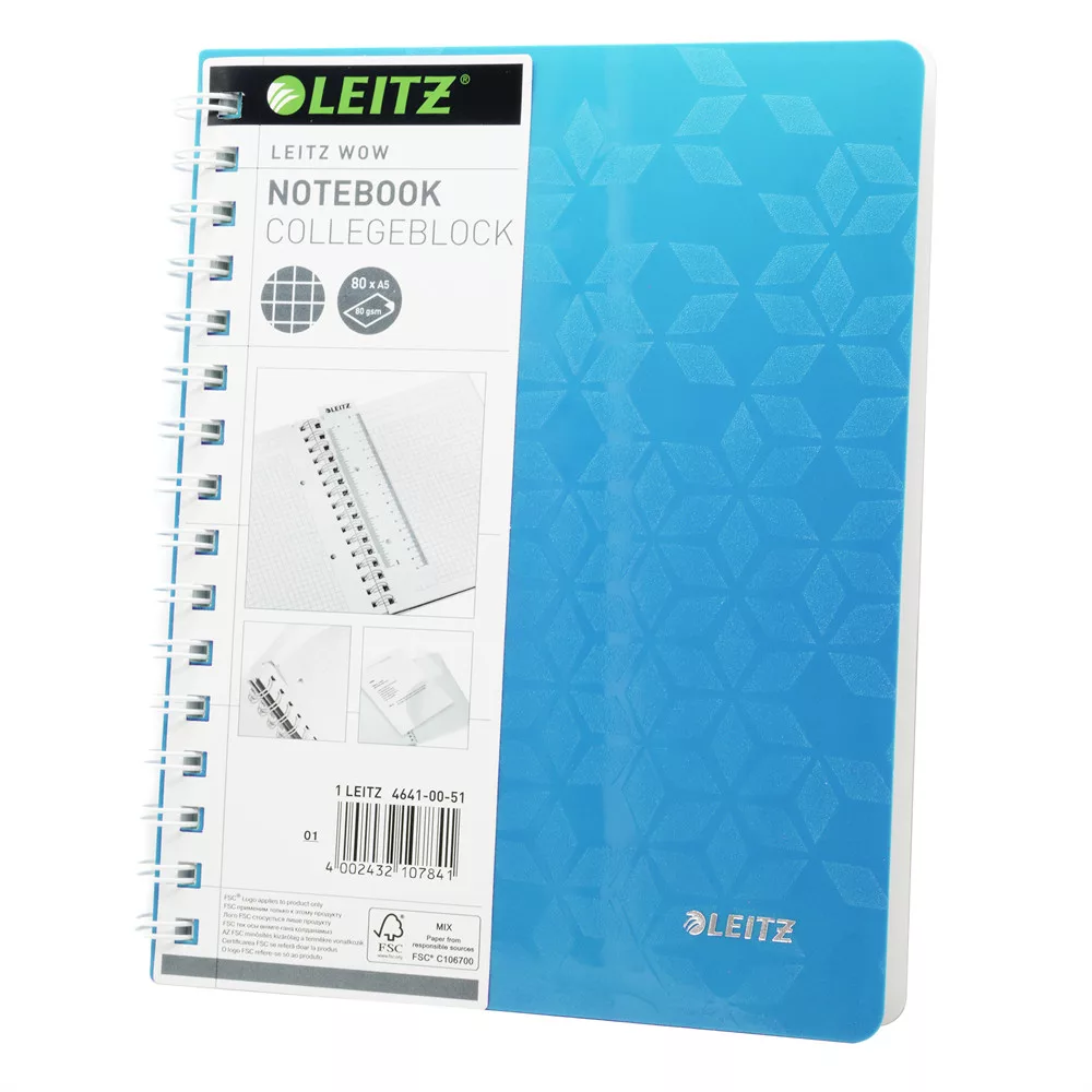 Spirálfüzet A5, 80lap kockás Leitz Wow jégkék