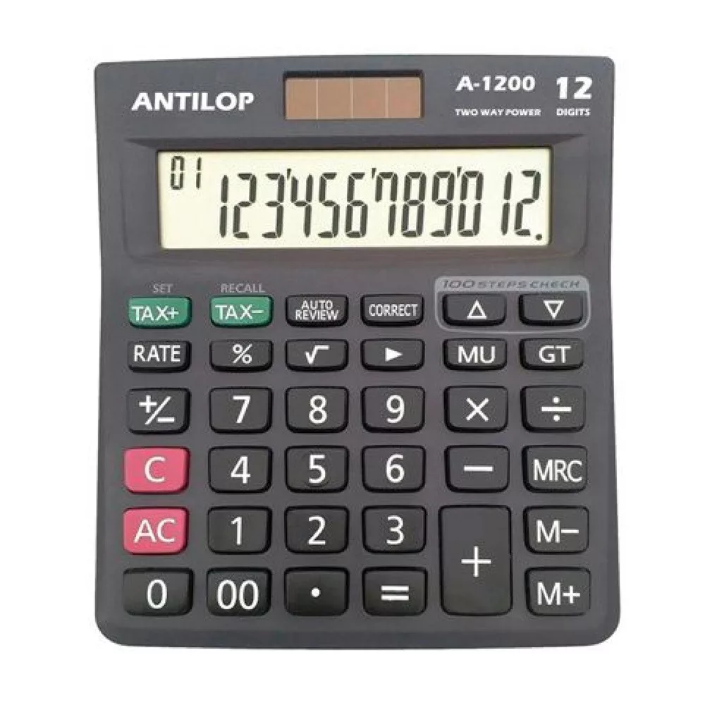 Antilop A1200 fekete asztali számológép 12 számjegyű nagy kijelző, memória funkció, ÁFA számítás, utolsó 300 művelet ellenőrzése és javítása, utolsó szám javítása, elem+napelem, árrés számítás, négyzetgyök, `00`, %, +/-, GT. Működési mód: napelem+elem. Méret: 140 x 120 x 40 mm. 80db/karton Katalóguskód: 1701