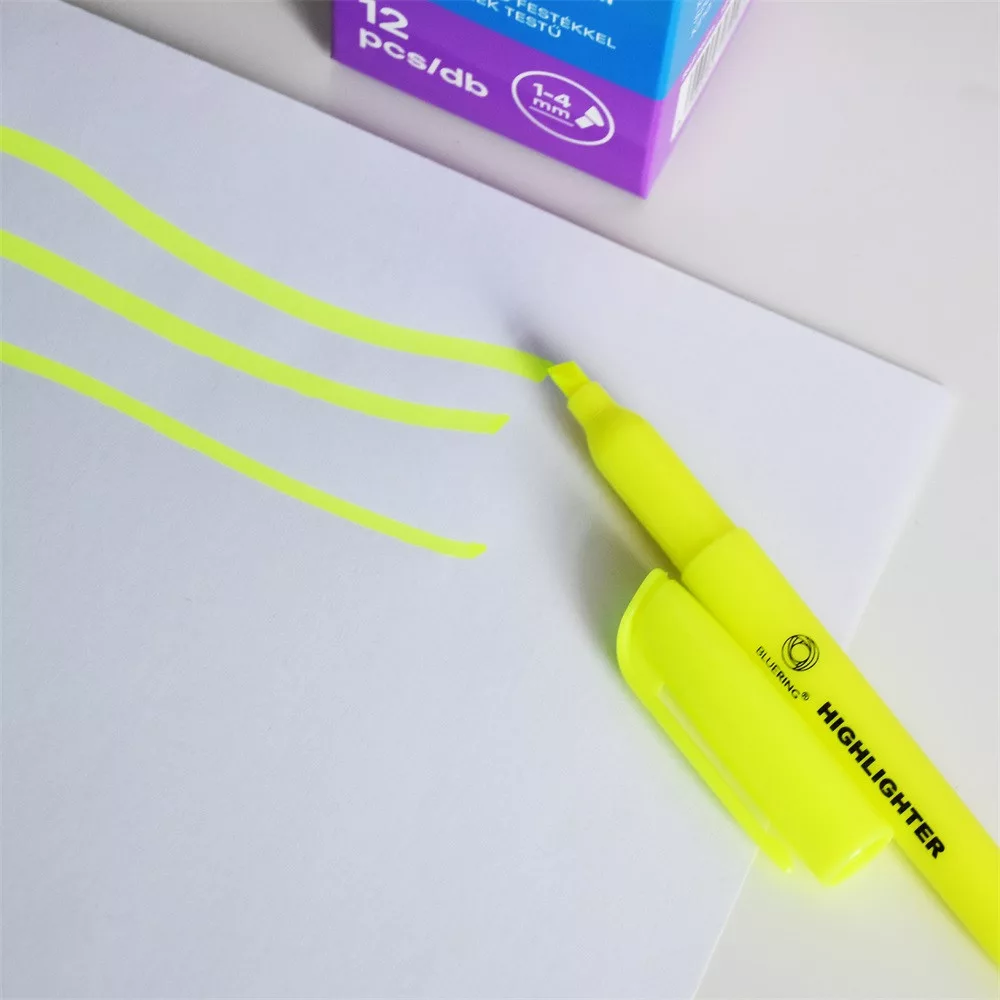 Speciális fluoreszkáló festékkel töltött kerek testű szövegkiemelő. A kiemelt szöveg fénymásolható,faxolható. Klippel ellátott kupak, mely légmentesen zár. Festék színével megegyező kupak és testszín. Vágott csúccsal, 4 féle élénk színben. Vonalvastagság: 1-2 mm (íróhegy élével), 3-4 mm (íróhegy lapjával). Katalóguskód: 12162