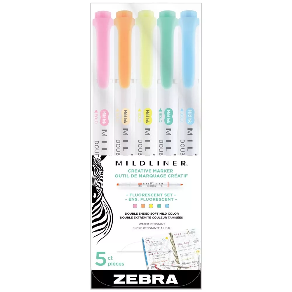 SZÖVEGKIEMELŐ KÉSZLET, 1,4/4 MM, KÉTVÉGŰ, ZEBRA MILDLINER FLUORESCENT, 5 SZÍN