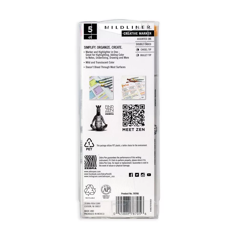 Szövegkiemelő készlet, 1,4/4 mm, kétvégű, Zebra Mildliner Highlighter Gentle, 5 különböző szín