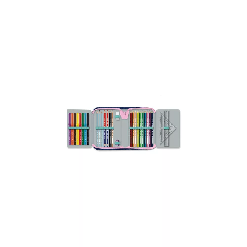 Írószerekkel töltött cipzáros tolltartó két kihajtható füllel, gumis kialakítással az írószerek tárolásához. Tartalma: 12 db színes ceruza, 3 db HB grafit ceruza, 1 vékony és 1 vastag postairón, 8 db színes filctoll, 1 db radír, 1 db hegyező, 1 db 17 cm-es egyenes vonalzó, 1 db háromszög vonalzó, órarend A és B hétre.