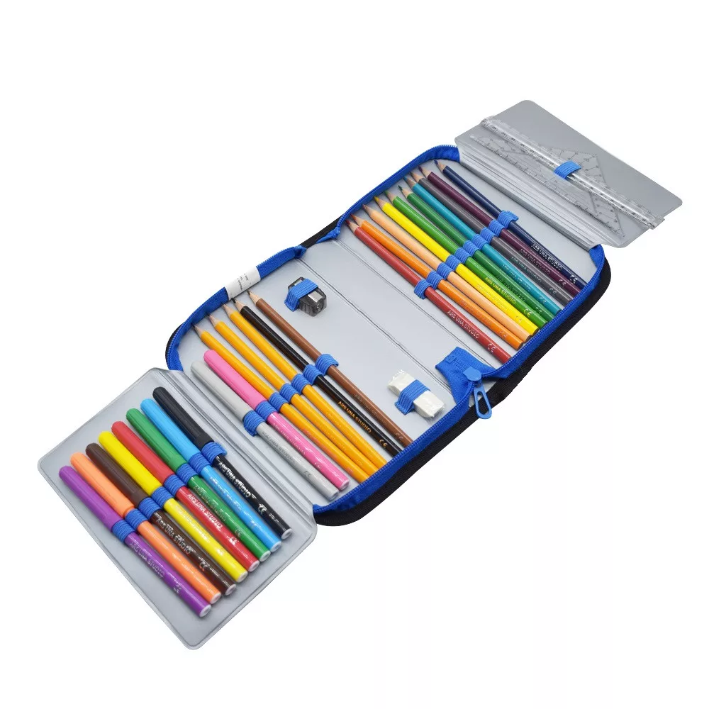 Egyrészes tolltartó. Minőségi egyrészes, cipzáras tolltartó két kihajtható füllel. Felszereltsége: radír,hegyező, 2 db vonalzó, 10 db filc, 12db színes ceruza, 3 HB grafit, 2db órarend,. Katalóguskód: 53452