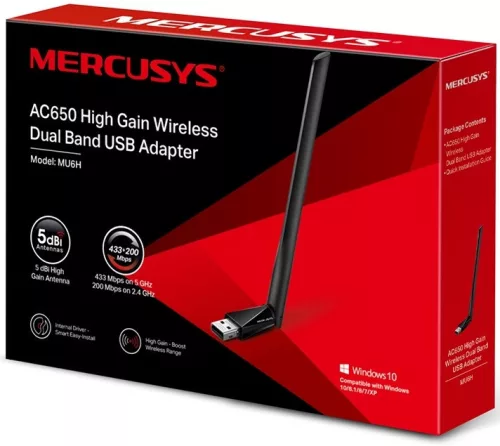AC650 kétsávos Wi-FiAz MU6H két külön sávon tudja fogadni a Wi-Fi jeleket. A 256-QAM technológia támogatása növeli a 2,4 GHz-es adatátviteli sebességet 150 Mbps-ről 200 Mbps-ra 33% -kal gyorsabb teljesítmény érdekében. Válasszon 2,4 GHz-et a szörfözéshez és a közösségi médiához, és 5 GHz-et akár 433 Mbps-ig HD streaminghez és online játékhoz.Növelje a vezeték nélküli hatótávolságot jó hatótávolságú antennávalAz 5 dBi erősítésű antenna pontosabb irányíthatóságával, messzebbről éri el a routert, gyorsabb és stabilabb vezeték nélküli kapcsolatokat fenntartva.Egyszerű telepítés Windows rendszerreA belső illesztőprogram azt jelenti, hogy csak csatlakoztatnia kell az MU6H-t a számítógéphez, és máris telepítheti az eszközt csak kövesse a képernyőn megjelenő utasításokat.Állítható, 360 fokos antennaForgassa és állítsa az antennát több irányba, hogy javítsa a csatlakozást a routeréhez.