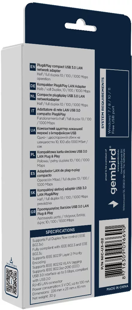 Plug&Play kompakt USB 3.0 LAN hálózati adapter: csak csatlakoztassa egy USB-porthoz, és kösse össze a hálózatával egy patch kábellelFél- és teljes duplex 10/100/1000 Mbps működésBeépített flash-meghajtó az illesztőprogramokkalLapkakészlet: AX88179 vagy RTL8153Támogatja a teljes duplex áramlásvezérlést (IEEE 802.3x)Teljes mértékben megfelel az IEEE 802.3 és IEEE 802.3u szabványoknakTámogatja az IEEE 802.1P Layer 2 prioritási kódolástTámogatja az IEEE 802.1Q VLAN címkézéstTámogatja az IEEE 802.3az-2010 (EEE) szabványtUSB 3.0 interfész akár 5 Gbps sebességig, kompatibilis az USB 2.0-valRJ-45 LAN csatlakozóEnergiafogyasztás: 5 V DC, legfeljebb 100 mAMéretek: 226 x 23 x 16 mmNettó tömeg: 30 g