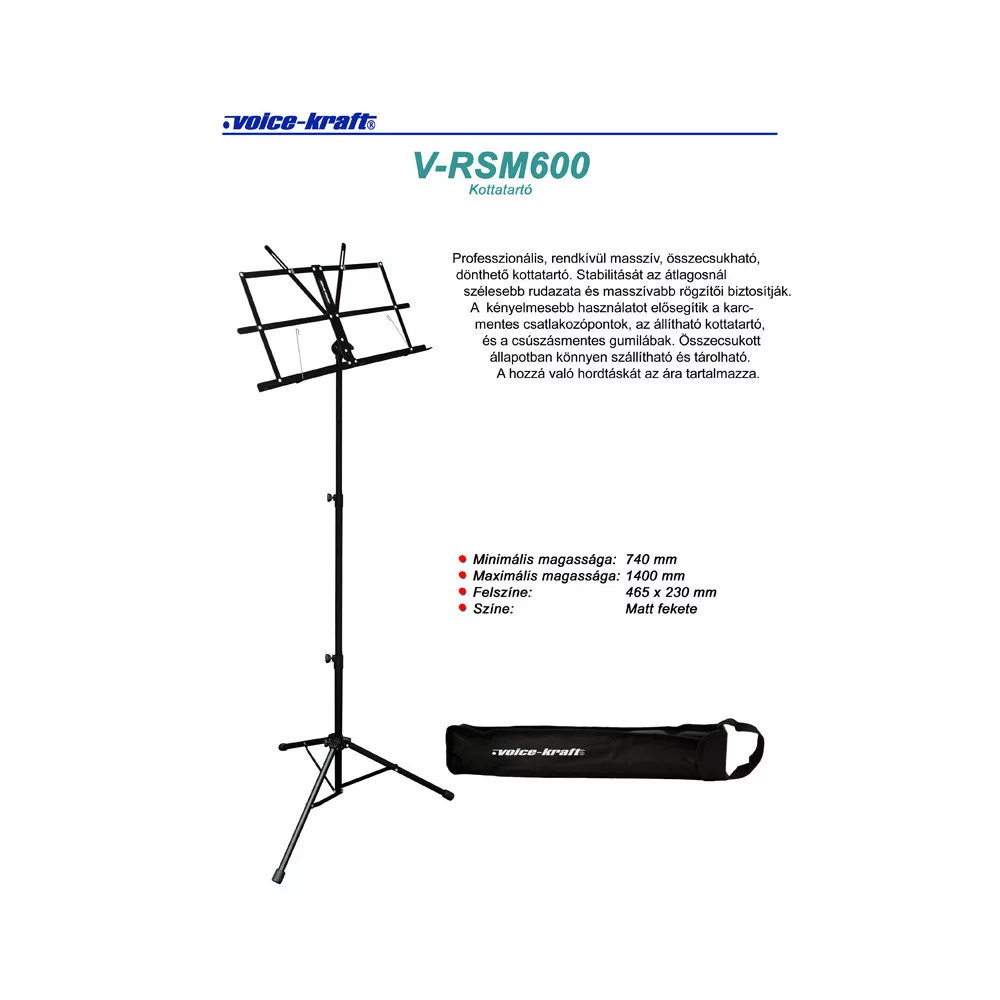 Professzionális, rendkívül masszív, összecsukható, dönthető kottatartó. Stabilitását az átlagosnál