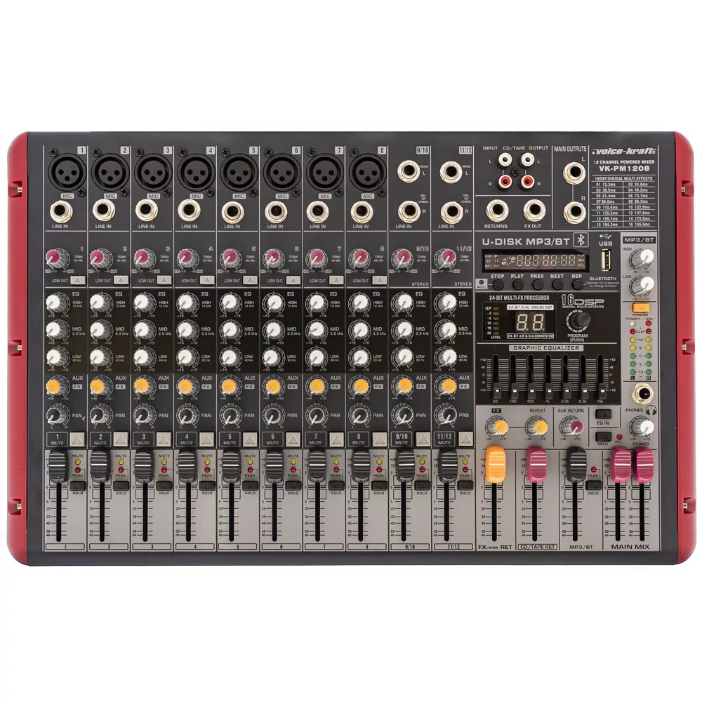 Ultra kis zajú 12 csatornás power mixerCsatornák száma: 8 Monó, 2+1 Sztereó és MP3 lejátszó