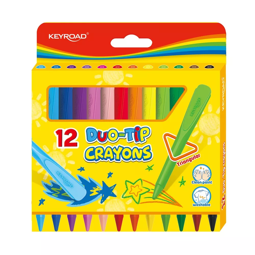 Két vég, dupla élmény! kétvégű zsírkréta háromszög alakú test a könnyed foghatóságért egyedülálló formula, amely nem teszi koszossá a kezeket ruhákból is könnyedén kimosható gyermekbarát anyagból élénk, intenzív színek 12 db/bliszter doboz
