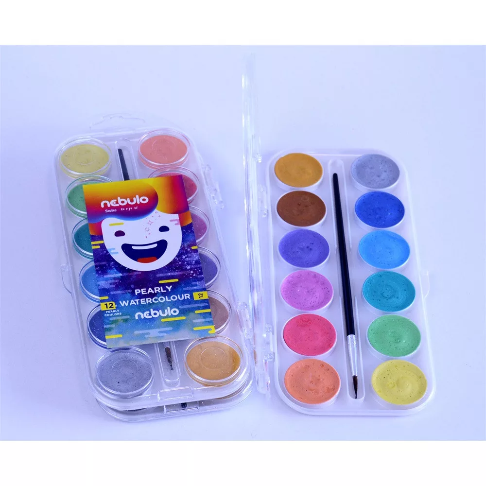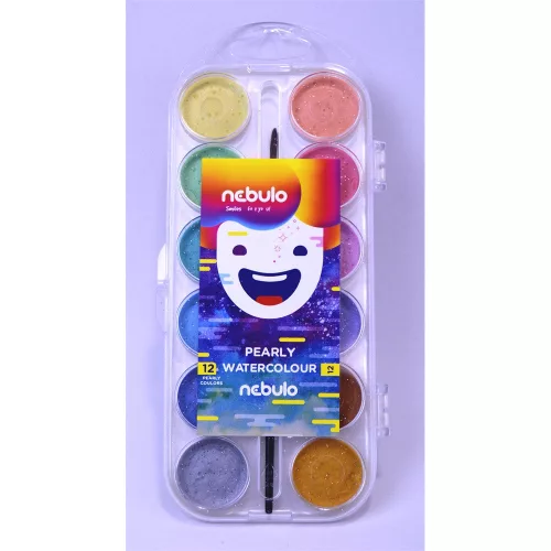 Gyöngyház színekkel rendelkező vízfesték készlet, ecsettel, praktikus műanyag dobozban. Könnyen oldódik és egyenletesen fed. Festékkorongátmérő: 30 mm Katalóguskód: 55665