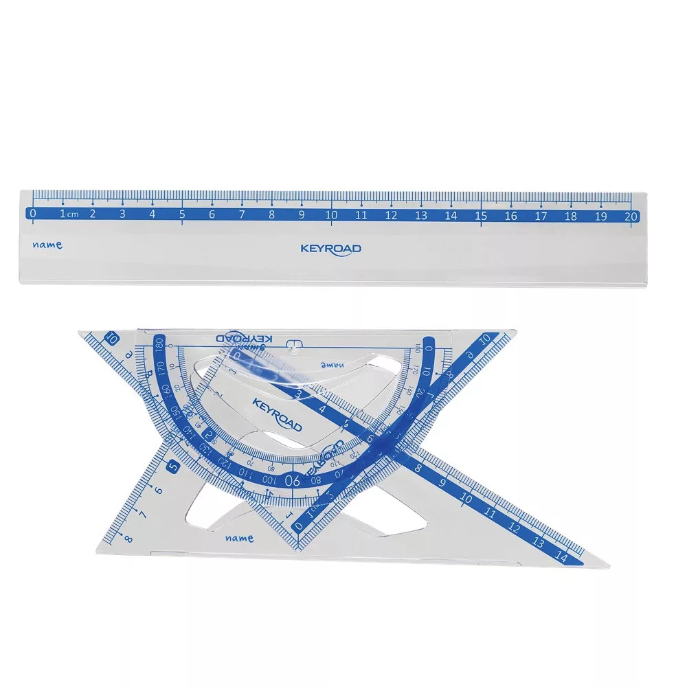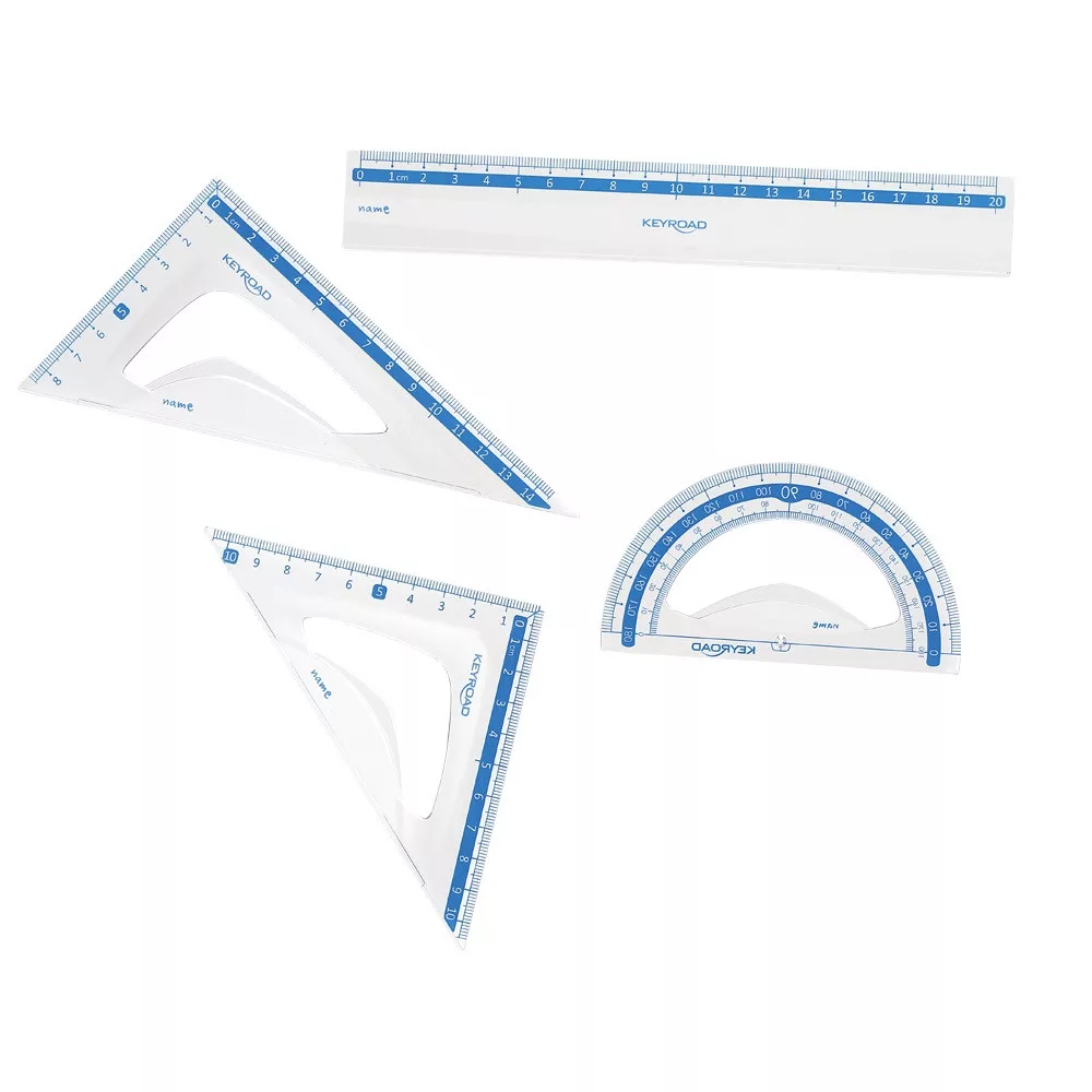 Vonalzókészlet, 20 cm, vonalzó, szögmérő, 45° és 60° háromszög vonalzók 4 db/bliszter Keyroad