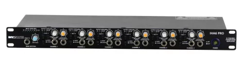 - Hat egymástól független magas teljesítményű stereo fejhallgató erősítő- Hat bemenet/AUX szekció - Direct In bemenet az előlapon- Minden csatornán magas és mély hangszínállítás, hangerő állítása és balance potméterek.- Egységenkénti némító kapcsoló- Három fejhallgató kimenet minden csatornán, egy az előlapon, kettő a hátlapon- Csatornánkénti ledes hangerőkijelző- Párhuzamos főkimenet melyre további fejhallgató-erősítők csatlakoztathatók- Tömeg: 3,1 Kg