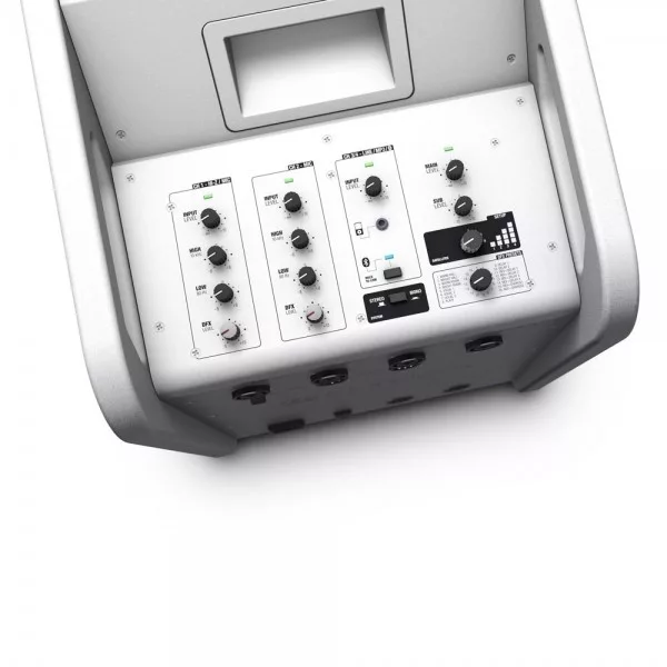 Mélynyomó csatlakozók: 1x Mic/Hi-Z (XLR/6,3 mm jack combo), 1x Mic (XLR/6,3 mm jack combo), 2x Line (XLR/6,3 mm jack combo), 3,5mm jack, 2 x Array Satellite Out (Speakon kompatibilis), Line Out (XLR), System Out (ötpólusú XLR)
