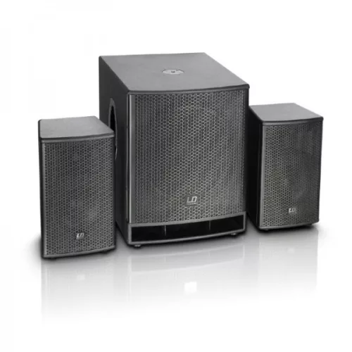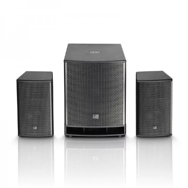 rétegelt lemezből készült zárt szatellit ládák 10”/1”-os koaxiális hangszórót tartalmaznak, a basszus reflex rendszerű mélynyomóba