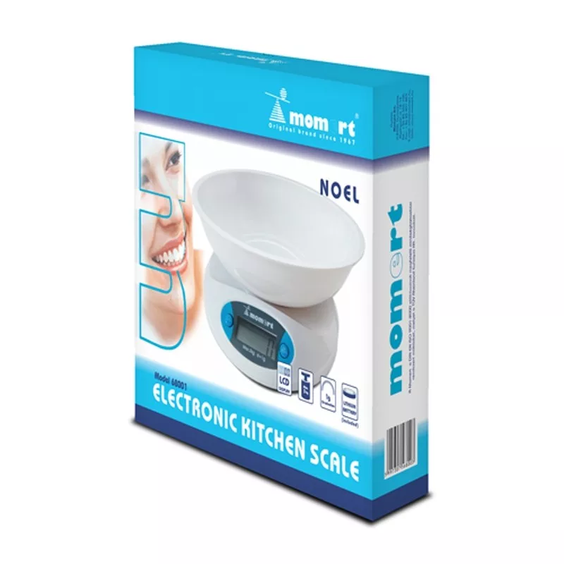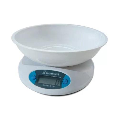 Elektronikus konyhamérleg, fehér színű, levehető tállal.