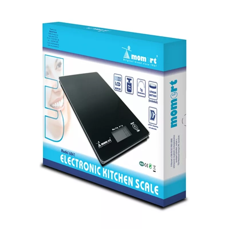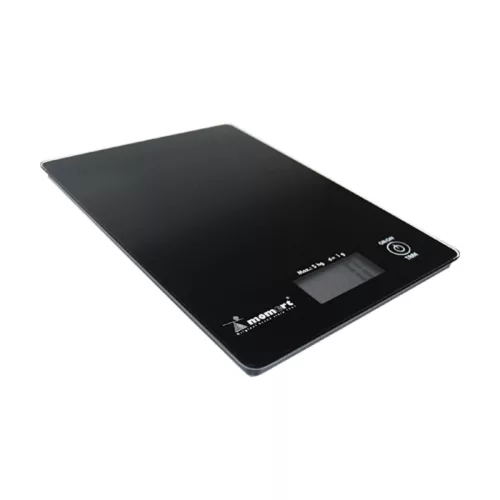 Elektronikus konyhamérleg fekete üveg felülettel, helytakarékos formával.